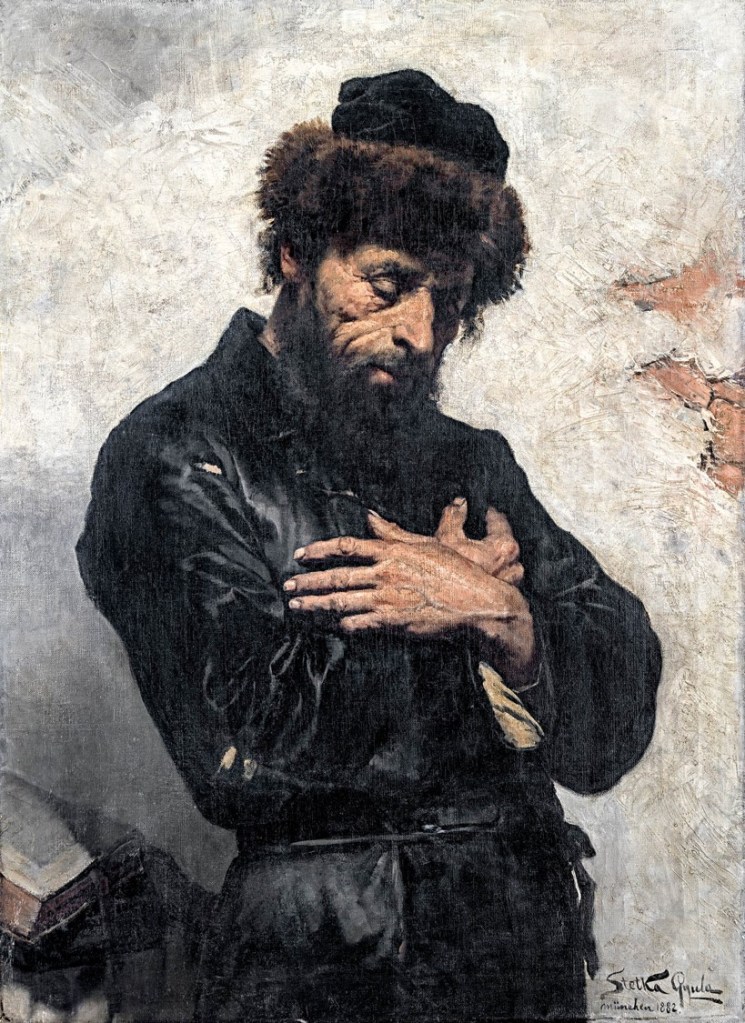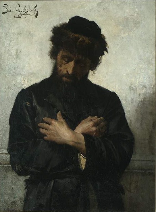 Modlący się Żyd Stefana Grocholskiego to często reprodukowany olej tego autora pochodzący ze zbiorów Muzeum Narodowego w Warszawie. Obraz prezentowany jest na stronie internetowej muzeum z datą powstania 1892, choć data to drobna pomyłka. Obok sygnatury jest miejscowość i data: Monachium 82. Ale nie o tym. Obraz ten łatwo zapada w pamięci tym, którzy interesują się Grocholskim, mnie włączywszy. Przeglądąjc niedawno katalog jednego z węgierskich domów aukcyjnych zobaczyłem modlącego się tego samego Żyda namalowanego troszkę pod innym kątem. Takie było pierwsze wrażenie. Ale to nie była druga praca Grocholskiego, choć łudząco podobna.