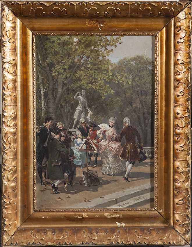 Lot 1030. WOJCIECH VON KOSSAK (Paris, 1856 – Krakow, 1942). Dance in the garden, 1882. Oil on canvas, 51 x 35.5 cm. Signed and dated in the lower right corner W. Kossak / 1882. On the back inscription and date. Starting 2,000.00 Euros. Fernando Duran. 06/12/19