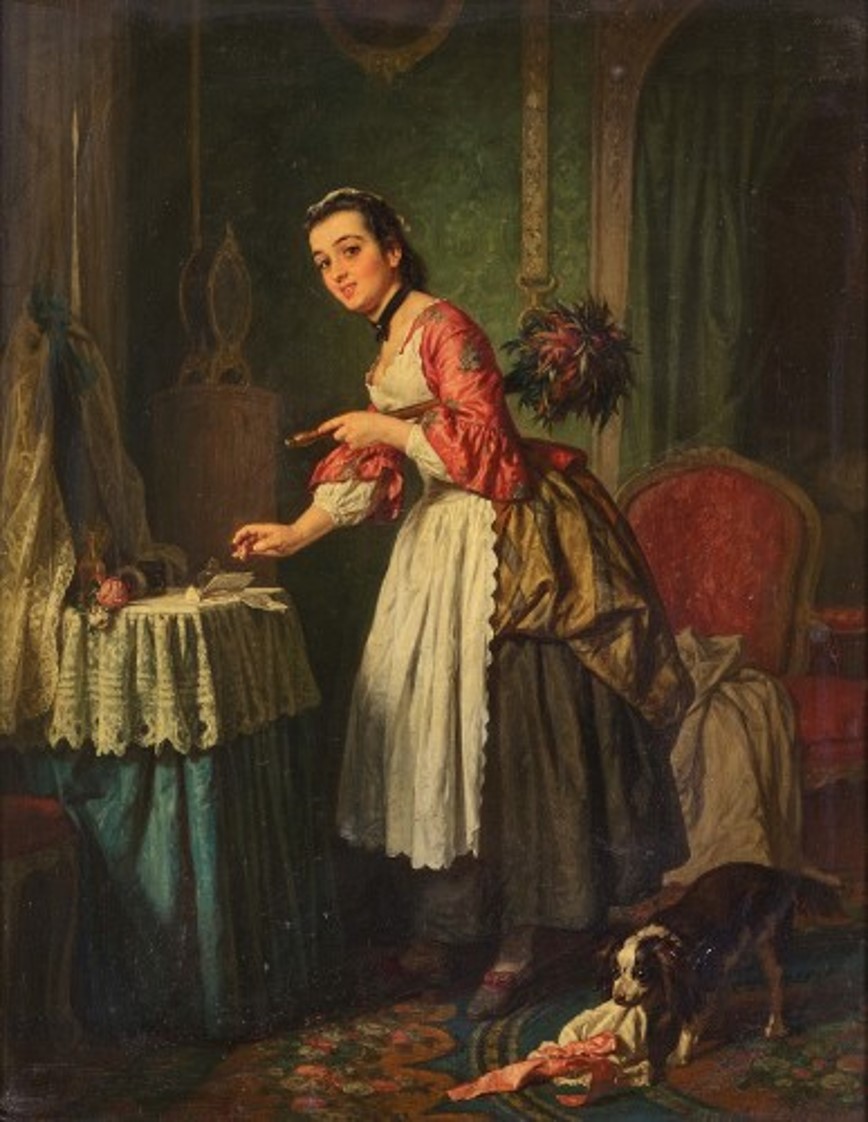 Mały wymiarami lecz bardzo dobry portret młodej kobiety w kremowej (?) sukni wykończonej koronką i w kapeluszu udało się komuś kupić pod koniec marca w Niemczech za jedyne 2,400 euro. Twarz skupiona, trochę nieufna, część buzi skryta w cieniu ronda dodaje i uroku i tajemniczości. Pogratulować trzeba takiego zakupu.