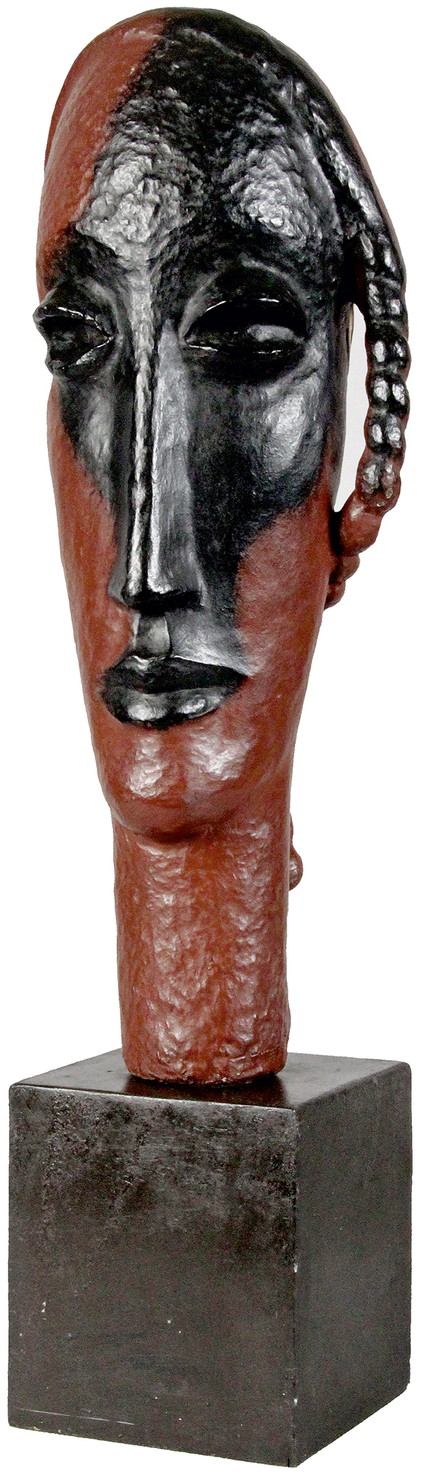 Lot 97. Jean LAMBERT-RUCKI – 1888-1967. TÊTE À LA TRESSE, 1937. Épreuve en bronze polychrome, signée du cachet J.D.V. et cachet de la fonderie de la Plaine, numérotée 2/8. Haut. : 44 cm – Long. : 18,5 cm – Prof. : 17,5 cm . Bibliographie: J. De Vos, M.-A. Ruan, J.-P. Tortil, Jean Lambert-Rucki, Ed. Galerie De Vos, Paris, 1988, n° 50 (plâtre original reproduit), p. 68. Estimation 12,000 – 15,000 euro. Eric Pillon. 06/30/19