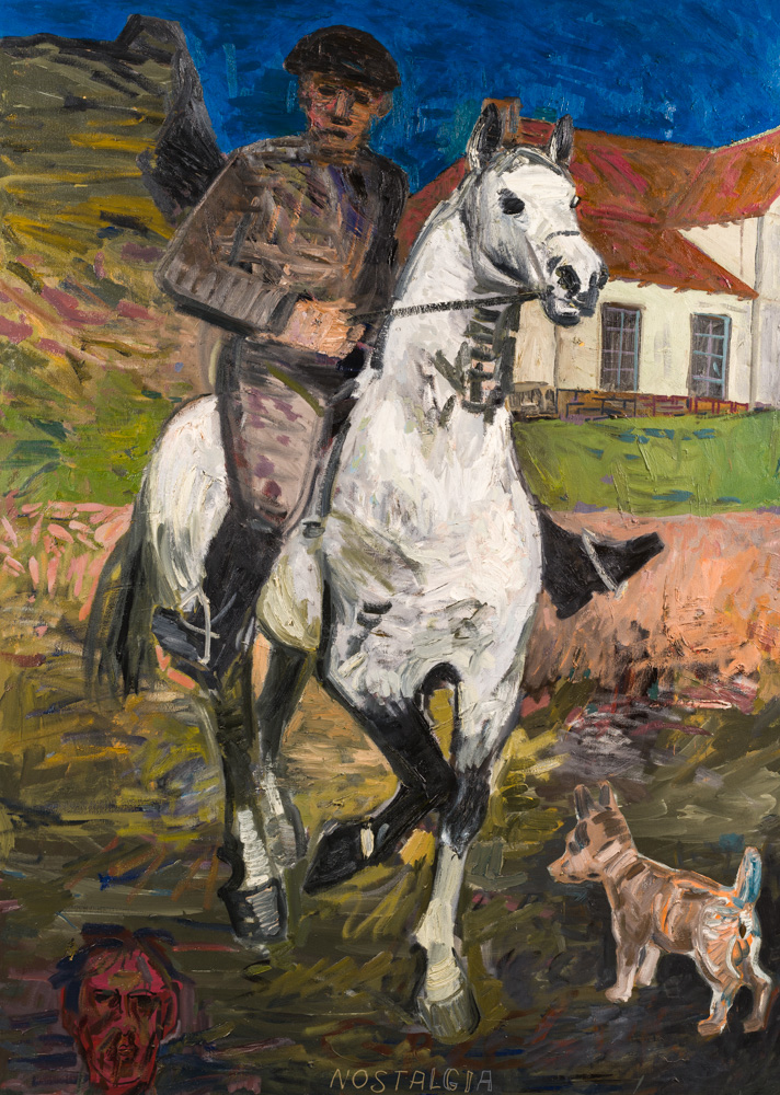 264. Edward Dwurnik (*1943) . Nostalgia, 1985–87 . Öl auf Leinwand, 210 x 150 cm, unten betitelt NOSTALGIA, ückseitig datiert, signiert und bezeichnet 1985–87 E. DWURNIK NOSTALGIA NR: XVI – 111 – 1019. Provenienz. Galeria Sztuki Biuro Wystaw. Austellung. Edward Dwurnik, Muzeum Narodowe we Wroctawiu, 1987 (gemäss rückseitiger Etikette). Schätzpreis: CHF 3’000 – 4’000. Beurret and Bailly. 06/19/19. Sold 6,500 CHF