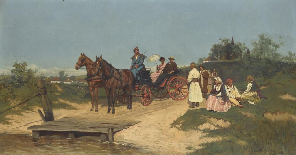 Lot 37. JAN KONOPACKI Polish 1856 – 1894. Waiting for the Ferry; signed and dated J Konopacki / Paris 1881 lower right, oil on canvas, 45 by 85cm., 17½ by 33½in. Provenance Maria Zaleska, France (by the 1930s); thence by descent. Exhibited: New York, The Metropolitan Museum of Art, Nineteenth Century Polish Paintings: A Loan Exhibition, 1944, no. 39 (as Waiting for the Ferry), illustrated in the catalogue, Montreal, McGill University, Polish Art Exhibition, 1966. Estimate 15,000-20,000 GBP. Sotheby’s. 07/09/19. Sold 12,500 GBP.