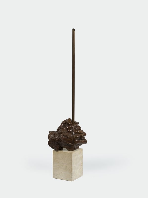 Unikatowa marmurowa rzeźba Mitoraja Ręce. Cena estymacyjna (60 000 – 80 000 €) odzwierciedla fakt, że jest to jedyny egzemplarz wyrzeźbiony w marmurze. Do postumentu wbudowana jest inna rzeźba Mitoraja Centurion II (brąz).