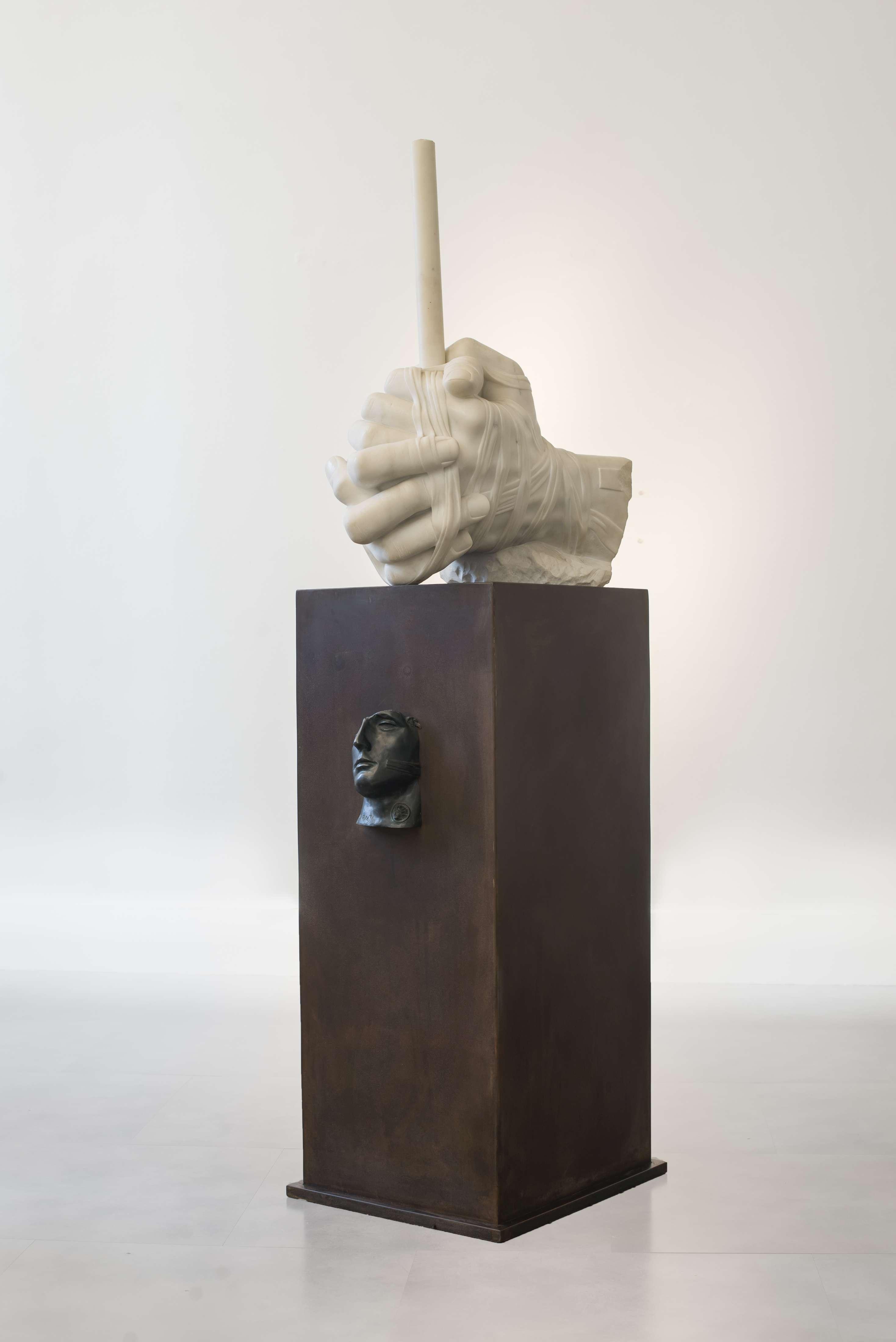 Lot 1142. Description: Igor MITORAJ (1944-2014). LES MAINS – 1990. White marble on patinated metal base with the bronze sculpture of “Centurion II” fixed signed on one hand; unique piece. Dimensions of the base: 100 x 40 x 45 cm. Dimensions : 73 x 52 x 34 cm. Provenance : Acquis directement auprès de l’artiste par l’actuel propriétaire en 1991, à Pietrasanta, Italie. Estimation 60 000 – 80 000 €. Artcurial. 07/19/19