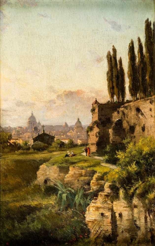 Trochę niewyraźna sygnatura na pracy z Niemiec przypomina mi sygnaturę Henryka Cieszkowskiego (1835 – 1895), który malował we Włoszech w II połowie XIX wieku. Może to byc jednak przypadek. Niektóre polskie portale internetowe już reklamują ten pejzaż rzymski jako jako duże wydarzenie warte wielokrotnego przebicia tych marnych rezerwowych 800 euro. Na jakiej podstawie? Proszę pisać – łamy otwarte.