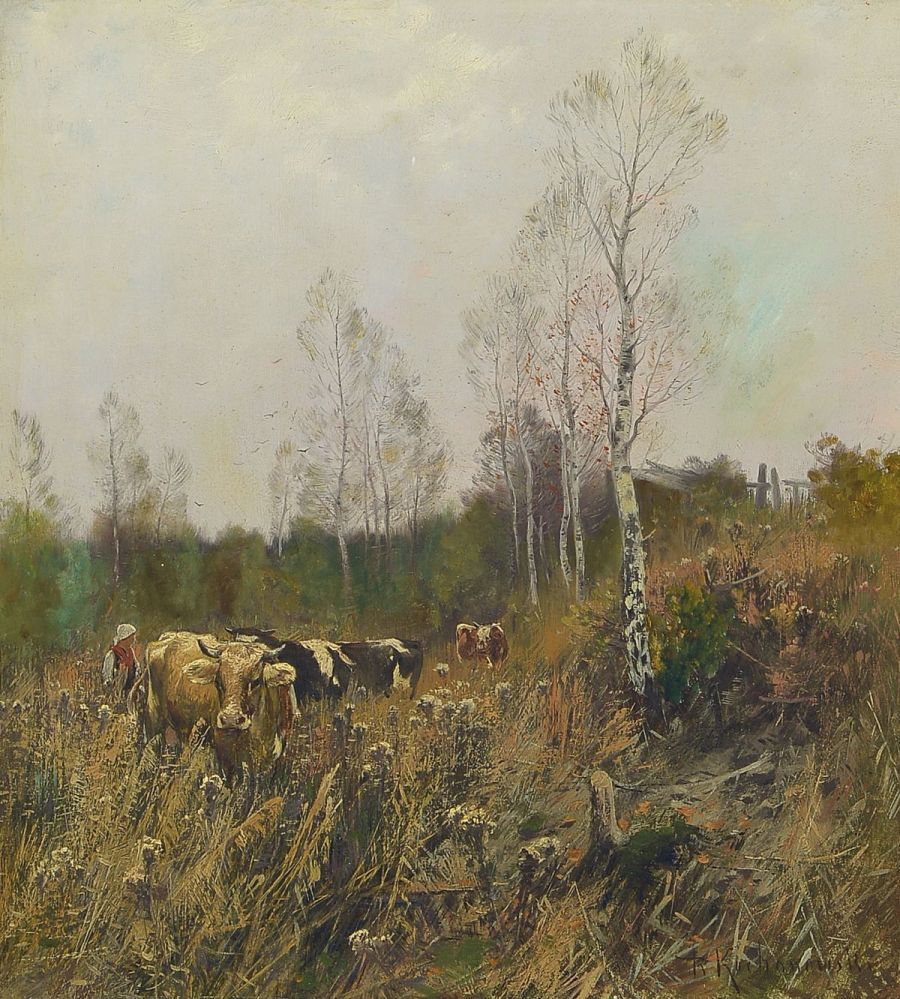 Lot 66192. Roman Kochanowski, 1857 Krakow-1945 Freising. Autumnal landscape with birches and tall grass, through which cows are driven by a young maid, oil / wood, signed lower right, approx. 37×32.5cm / 63x59cm, frame. Reserve 800 euro. Henry’s. 06/30/18