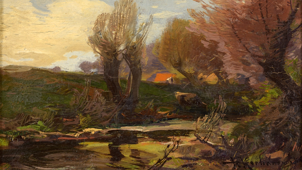 Lot 3023. Kochanowski, Roman (Krakau 1856-1945 Freising). Herbstliche Landschaft. Öl auf Holz. Sign., nicht bezeichnet und dat. (wohl um 1900/10). 22,7 x 30,5 cm. – Späterer Holzrahmen. (56) FLußlandschaft mit arbeitenden Bauern im Vordergrund. – Kochanowski “ließ sich in München nieder, von wo aus er von Zeit zu Zeit die Heimat besuchte. Stellt seit 1877 aus u. gehört zu den besten poln(ischen) Landschaftsmalern seiner Zeit. Malt vorwiegend Motive aus der Gegend von Krakau u. dem Weichselgebiet” (Thieme/Becker XXI, 98). Estimate 800 euro. Zisska & Lacher – Buch- und Kunstauktionshaus. 11/09/18.