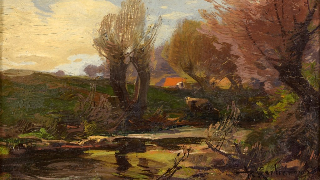 Zaczynam przegląd od pięknego zadrzewionego pejzażu z pasącymi sie krowami. Pejzaż, ten ma na Kochanowskiego olbrzymie wymiary (37 x 32.5 cm). Bardzo fotograficzny sposób malowania oraz wymiary pracy świadczą o powstaniu jej wkrótce po 1890 r. Nie wiem dlaczego, ale prace Kochanowskiego sprzed 1900 roku cenione są najwyżej. Tę sprzedano za 5,300 euro. W Polsce rekord sprzedaży to 51,000 złotych (ca $13,000) w Agrze-Art za mały pejzaż (7.5 x 22 cm), również z wczesnego okresu.
