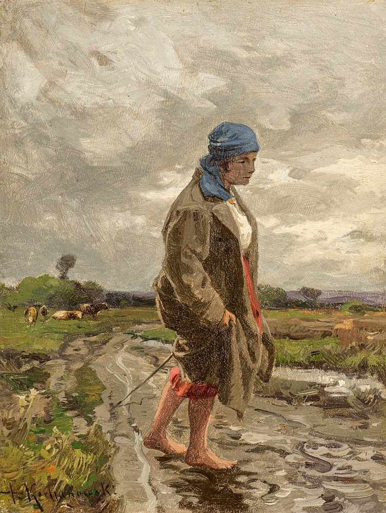 Lot 3481. Kochanowski, Roman 1857 Krakow – 1945 Freising. Cowherdswoman. Oil on panel. Signed lower left. H 26,5, W 20 cm. Reserve 800 euro. Kaupp. 10/20/18