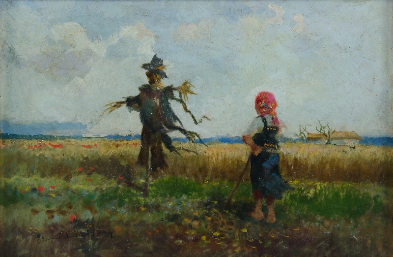 Lot 523. CIECZKIEWICZ, Edmund (Polish 1872-1958). Scarecrow & Peasant Girl in a Field. Oil on Card, 22x33cm. Estimate $100.00 – $200.00. Davidson. 06/24/18. Sold AUD 180