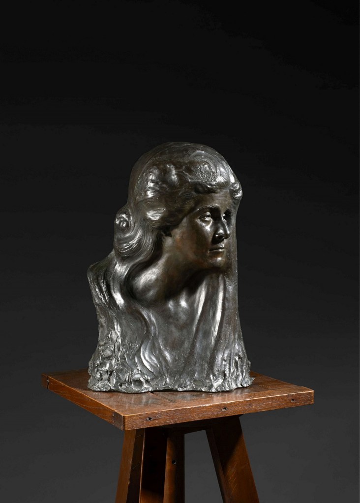 Lot 610. Boleslas BIEGAS Koziczyn, 1877 – Paris, 1954. Portrait de Jadwiga Truschel. Bronze à patine brune, signé, localisé et daté ‘B. Biegas / Paris / (?) 1906’ à droite. Hauteur : 53 cm (20,86 in.). Repose sur une sellette tripode et pivotante en chêne patiné. Estimate 4,000 – 6,000 euro. Artcurial. 09/24/19. Sold 11,700 euro