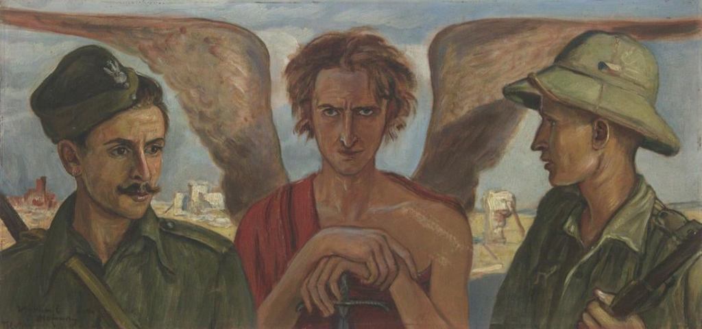 Lot 23. Vlastimil Hofman (Poland, 1881-1970) – Angel of justice, Oil on Board, Tel Aviv, 1941. Titled on the reverse – Anioł Sprawiedliwości. Depicting the Angel of Justice in the center with the artist’s portrait on one side and a Czech soldier on the other, 23 x 47cm. Estimate $5,000 – $8,000. Pasarel. 09/12/19