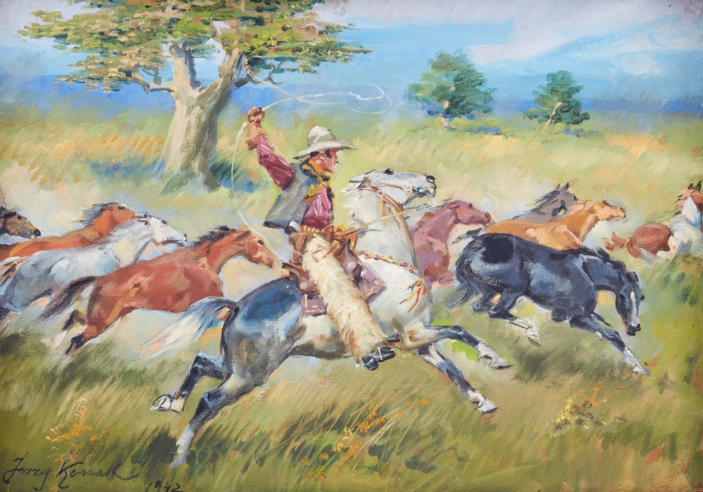 Lot 569. Jerzy Kossak Polen 1886‑1955. Cowboy och hästar. Signerad och daterad Jerzy Kossak 1942. Olja på pappannå, 35 x 50 cm. Med stämpel på baksida: ”JERZY KOSSAK. Kraków. Pl. Kossaka”. Estimate 6,000 – 8,000 SEK (560 -750 euro). Uppsala. 10/08/19