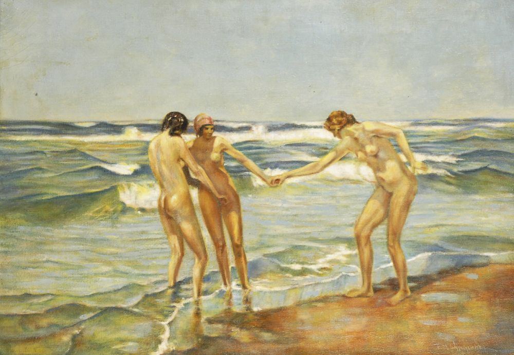 Feliks Michał Wygrzywalski??? Drei nackte Frauen am Strand im Sonnenschein