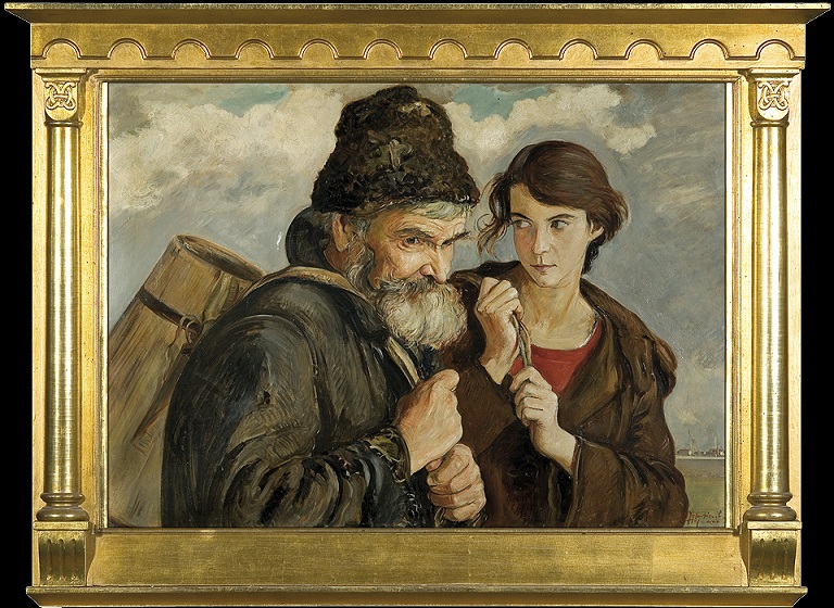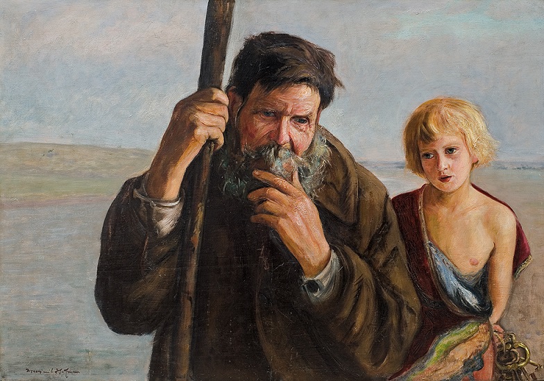 Wlastimil Hofman. GŁOS: KRZYSZTOFIE! KRZYSZTOFIE!. Olej, sklejka, 70 x 100 cm. Źródło: Agra-Art Wlastimil Hofman. WĘDROWCY. STARZEC I DZIEWCZYNA, 1922. Olej, tektura, 70 x 96,5 cm. Źródło: Agra-Art