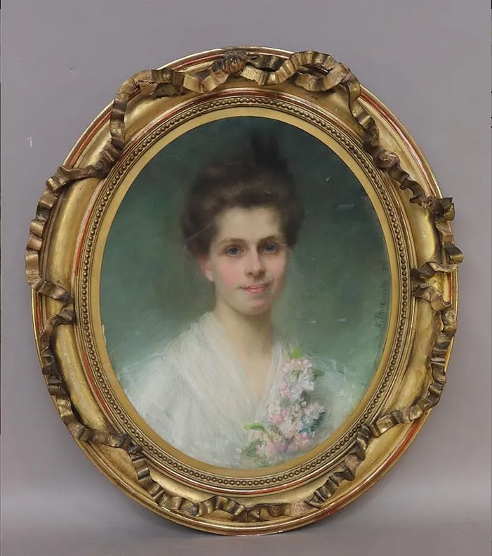 Lot 9. Ecole polonaise début XXe. “Portrait de femme au col fleuri“. Pastel à vue ovale. Signé K. Dziekonska et daté 1903 à droite. Dim. 53.5 x 44 cm (à vue). Estimation: 400 – 600 €. Maître LEFRANC Frédéric. 10/06/19