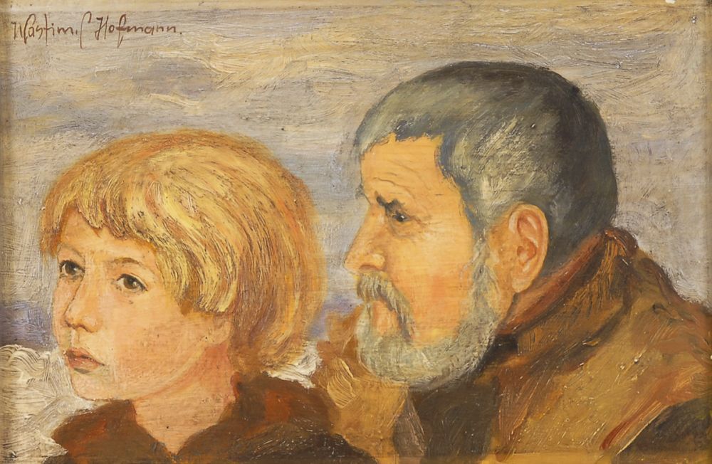 Lot 4080. HOFMANN, Vlastimil: Jung und Alt. Öl/Holz, links oben signiert. 15 x 24 cm, Goldstuckrahmen 31 x 39 cm. Junges Mädchen neben ergrautem Mann in winterlicher Landschaft. Polnischer Maler (1881 Prag – 1970 Szklarska Poreba). Reserve 1,200 euro. Wend. 10/26/19