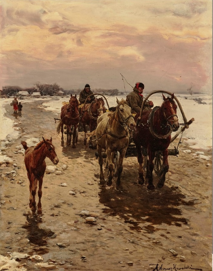 Tej pracy nie widziałem w żadnej z książek/albumów wydanych o malarzu przez prof. Elize Ptaszyńską – wygląda na nową na rynku. Bardzo dobra, nieduża praca Wieusza o niepodrabialnym przez innych błocie i topniejącym śniegu. Podobne tematycznie prace malarskie tego malarza z wozami jadącymi błotnistą drogą, światlem odbijającym się od kałuż powstałych ze stopniałego śniegu jest kilka jednak żadna z nich, a ta w szczególności, nie jest repliką innej. Ciekawe, że nawet J. Konarski nie probował malować tego typu słot na drodze. A+