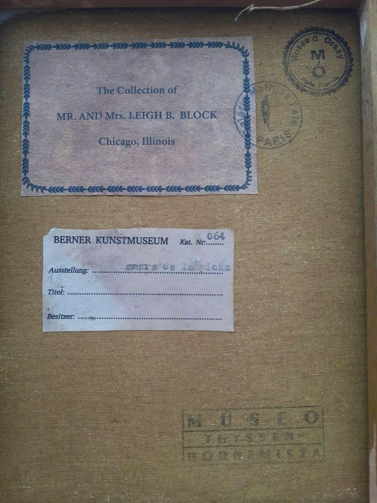 Jedna nalepka jest z Muzeum w Bernie, jest stempel z Muzeum d’Orsay, są również dwa inne stemple w tym jeden nałożony na nalepkę bardzo znanej Kolekcji Blochów z Chicago. Ta kolekcja istnieje do dzisiaj, można pojechać tam, umówić się i obejrzeć ponad 5 tysiące prac malarskich. Nie słyszałem by prace by z tej kolekcji były sprzedawane ale to nie znaczy, że nie były. Słowem, wysłałem zapytanie do kuratorów tego muzeum i czekam na ich odpowiedź, aby potwierdzili fakt posiadania tej pracy kiedyś w kolekcji. Napiszę osobno jaka była odpowiedź, choć spodziewam się, że tej pracy nigdy tam nie było. Zadziwiającym jest, aby taka średnia praca była wystawiana z fanfarmi aż w tylu muzeach. Wydaje mi się, że ktoś przedobrzył z tymi nalepkami i stemplami. Jeden stempel mógłby wystarczyć i w dodatku powinien być średnio wyraźny by fałszerstwo wyglądało dobrze. Pięć certyfikatów uwierzytelniających, wysyp jak z rogu obfitości, powinno wzbudzić podejrzenia. Podobnie było ostatnio z Wyspiańskim, choć w tamtym przypadku była to wielka amatorszczyzna. Ciekawe case study.