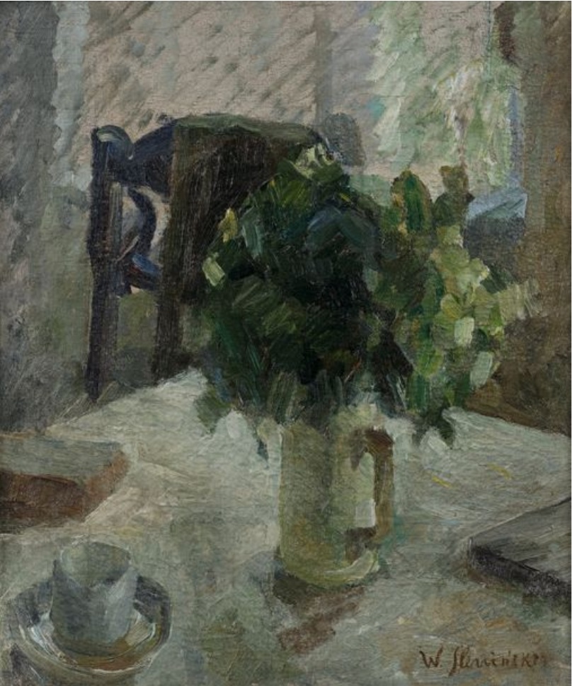 Lot 50. Wladyslaw SLEWINSKI (Bialynin 1856 1918 Paris). Nature morte avec bouquet de feuilles, 1907/8. Huile sur toile signée en bas à droite. 56 x 47,5 cm. Exposition: Torun, Musée Régional, 04.04.1999-16.10.2001. Provenance: Collection privée, Lwów (aujourd’hui Lviv); Collection privée, Varsovie, Une copie du certificat de Mme. Prof. Wladyslawa Jaworska du 11.02.1998 sera remis à l’acquéreur. Une expertise du laboratoire de l’Université Nicolas Copernic à Torun ainsi qu’un jeu des photographies sous les éclairages spéciaux sera remis à l’acquéreur. Estimate 35,000 – 40,000. Oger-Blanchet. 11/25/19