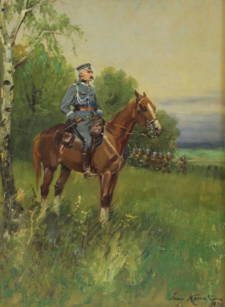 Jedna z wielu wersji Wojciecha Kossaka ‘Piłsudskiego na Kasztance’ (poniżej) powstałego w 1928 roku. Kompozycja cieszyła się sporą popularnością i dlatego Wojciech jak i Jerzy Kossak tworzyli repliki w dużej ilości. Wojciech w swoich wspomnieniach pisał o tych obrazach jako o ‘Piłsudach’ i o sporych na nie zamówieniach. Był to szybki zysk dla obu malarzy. Sprzedawany na obecnej aukcji obraz został namalowany przez Jerzego Kossaka, choć autorem kompozycji był oczywiście Wojciech. Porównując obie prace dobrze widać różnice warsztatu i jakości prac obu artystów. Praca Jerzego jest słabiutka a jej wartość artystyczna, jako repliki z replik, jest minimalna. Na pewno z moją opinią nie zgodzą się zwolennicy Piłsudskiego i liczę, że to oni będą zażarcie walczyli o tę pracę.