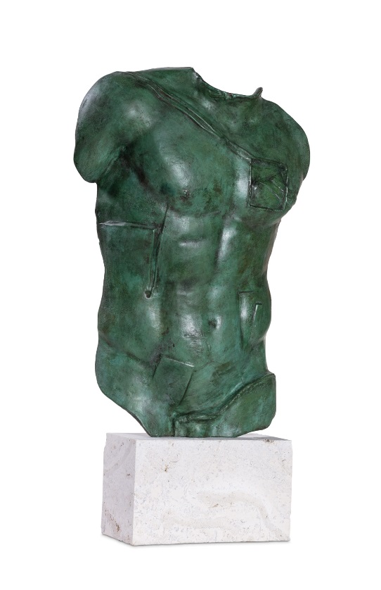 Lot 74. Igor MITORAJ (1944-2014), Torse, bronze patiné vert-de-gris, édition Artcurial n 320/1000, sur son socle en travertin. Haut. totale: 42 cm; Larg.: 40 cm. Estimate 800 – 1,200 euro. Villanfry & Associes. 11/20/19