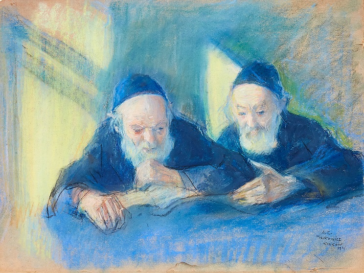 Dysputa religijna rabinów. Temat był bardzo popularny, malowany w wielu wersjach przez wielu malarzy, włączając Markowicza. Tym razem…so, so.