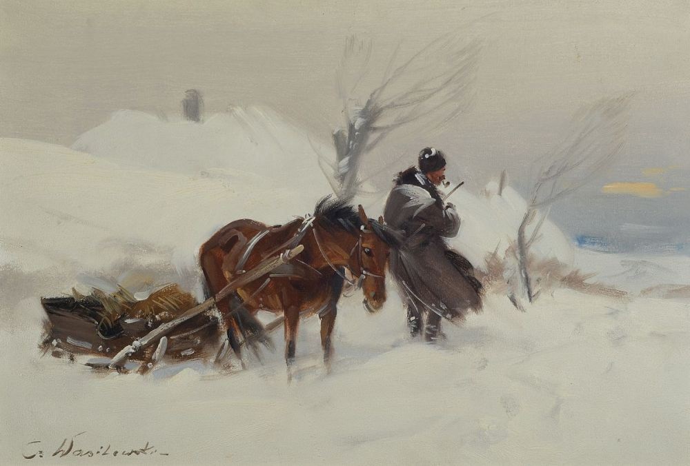 Lot 126066. Czeslaw Wasilewski, pseudonym of Ignacy Zygmuntowicz, c. 1875-1947. Farmer with sleigh, oil / cardboard box, signed lower left C. Wasilewski, c. 33x48cm. Reserve 400 euro. Henry’s Auktionshaus. 10/28/19