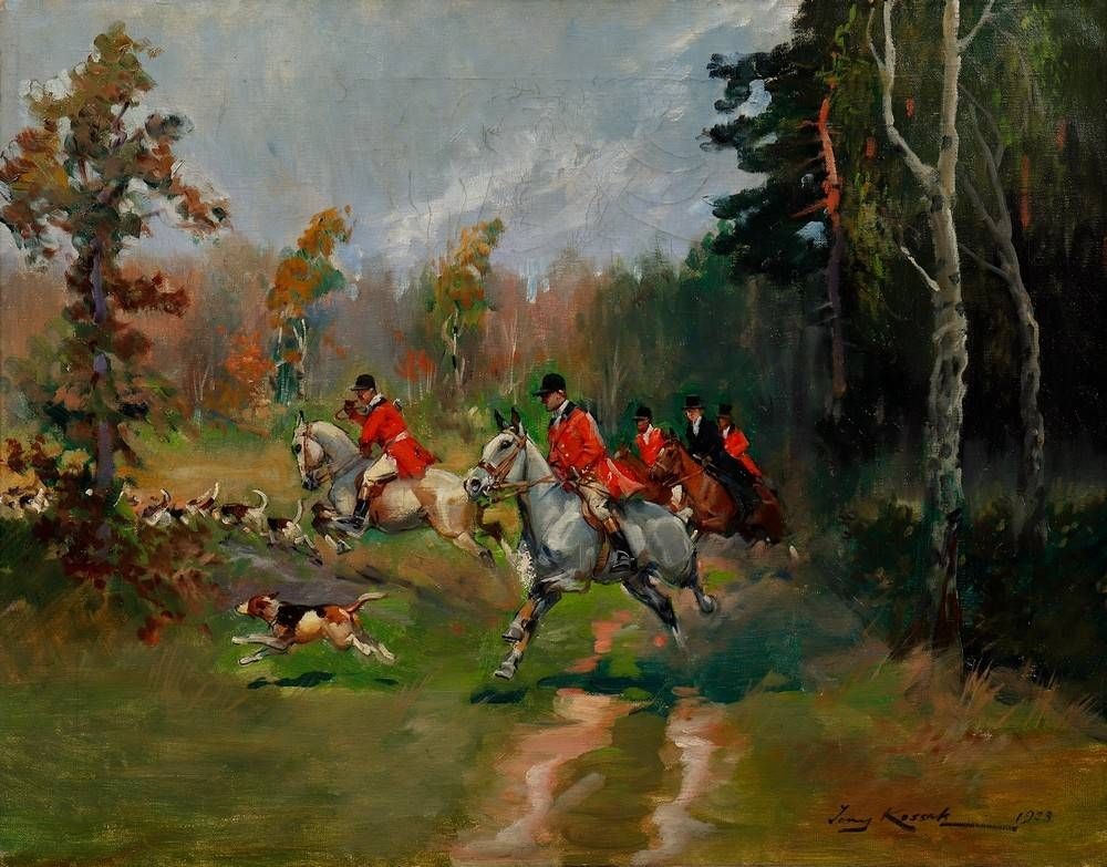 Bardzo dobry obraz Jerzego Kossaka, namalowany w dobrym okresie, bo w początkach lat 20-tych (1923) był licytowany w Niemczech. Scena myśliwska przedstawiająca polowanie ‘par force’, nawiasem mównąc mające mało wspólnego z polskimi polowaniami, być może z angielskimi, została sprzedana za marne 1,900 euro. Scena nie była kopiowana przez Kossaka, choć malował inne wersje jego tego tematu. Zastanawiam się, dlaczego ktoś za ewdentnego fasa Jerzego Kossaka z innego niemieckiego domu aukcyjnego (Schloss Ahlden) (https://polishartcorner.com/2019/11/19/jerzy-kossak-1886-1955-47/) zapłacił kilka dni temu 3,900 euro a tutaj porządny obraz kosztował połowę tamtego bullshita? Do Jerzego Kossaka można mieć krytyczny stosunek za powielanie replik, lecz trzeba mu oddać, że potrafił też malować porządne prace i nad zakupem takich właśnie można się zastanawiać.
