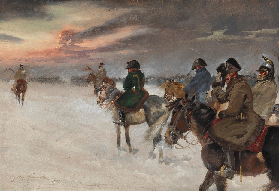 Lot 8. Jerzy Kossak. (Krakau 1886-1955). Napoleons Vision, im Hintergrund Moskau, signiert, datiert Jerzy Kossak 1930, auf der Rückseite Beschriftung sowie Signaturenstempel Jerzy Kossak und Stempel Jerzy Kossak Krakau PL Kossaka 4, eingefügt die Nr. 1421, Öl auf Karton, 55 x 80 cm, gerahmt. Vergleiche in: Kazimier Olszanski, Jerzy Kossak, Krakow 1992, Tafel 55 und 56. Provenienz: Privatbesitz, München. Estimate 5,000 – 7,000 euro. Dorotheum. 12/19/19