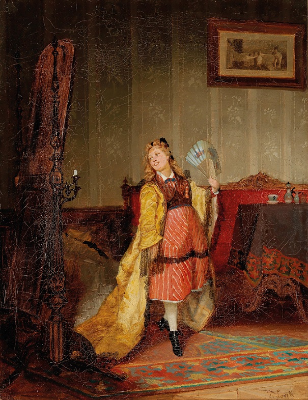 Nieduża scenka rodzajowa mało obecnie znanego w Polsce Tomasza Łosika, namalowana około 1875 roku lub nieco przed, na aukcji w Dorotheum. Obraz ten jest dobrze znany w litereaturze, był wystawiany i prawdopodobnie pochodził z kolekcji Leopolda Kronnenberga. Polski tytuł to ‘Kokietka’. Praca wygląda, że została poddana konserwacji i jest dublowana na płótnie i prawdodpodobnie została nieco obcięta – znane są bowiem jej wymiary, podane w innych źródłach, i chyba teraz ubyło jej 1-3 cm z każdej strony. Czernie na tej pracy malowane były chyba farbami asfaltowymi i stąd te potworne spękania, jakie trudno będzie naprawić. Na pracy widać dwie sygnatury (jedna ukryta pod ramą i tylko fragmenty wychylaja się spod niej) i ktoś chyba ‘majstrował’ przy tej widocznej (tj. poprawiał jej litery). W sumie, autor rzadki, kompozycja taka sobie i tchnie myszką, płótno zniszczone (krakelury i spękania farby). Pomino tych niedogodności warto ją mieć jeśliby została kupiona poniżej widełek estymacyjnych.