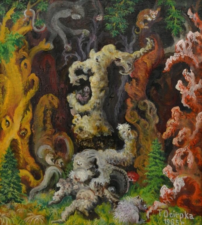Lot 206. Teofil Ociepka. POLISH, 1891-1978, Haunted Forest,1965, oil on canvas, signed, dated, 19 x 17.5 in., 48.3 x 44.5 cm. Estimate 1,200 – 1,600 CAD. Walkers. 12/11/19. Sold 600 CAD (hammer)