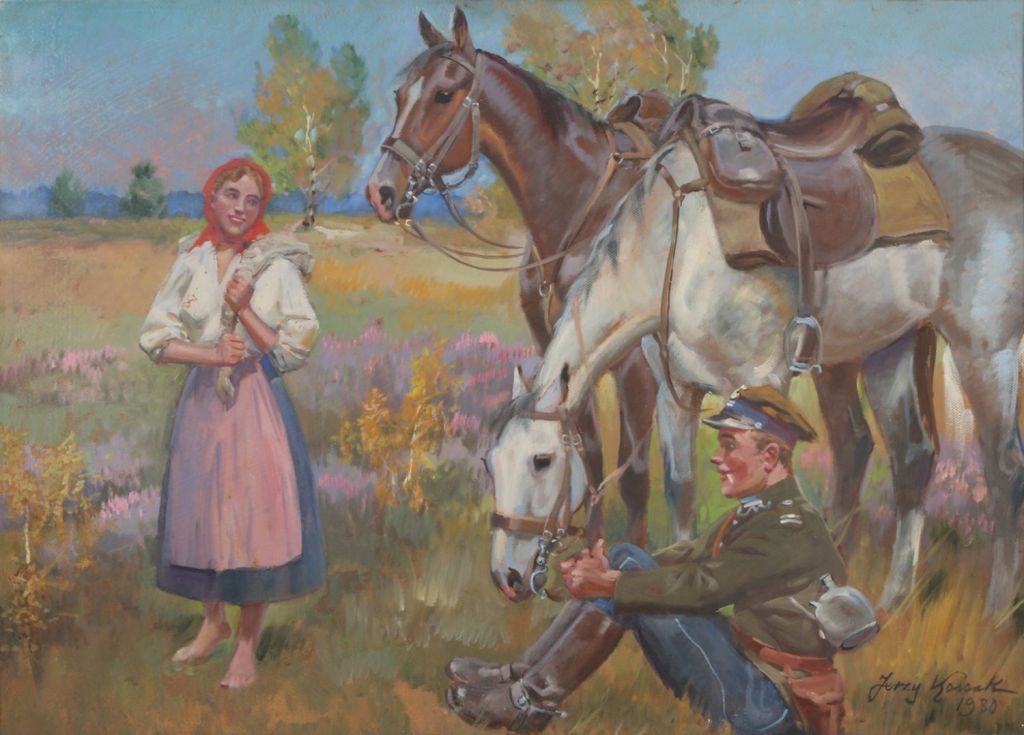 Lot 252. Jerzy Kossak. Soldier, Young Girl and a Horse, 1930. Oil and gouache on cardboard, 70X100 cm. Signed and dated. Estimate $4,000 – 6,000. Start price $3,600. Tiroche. 01/25/20