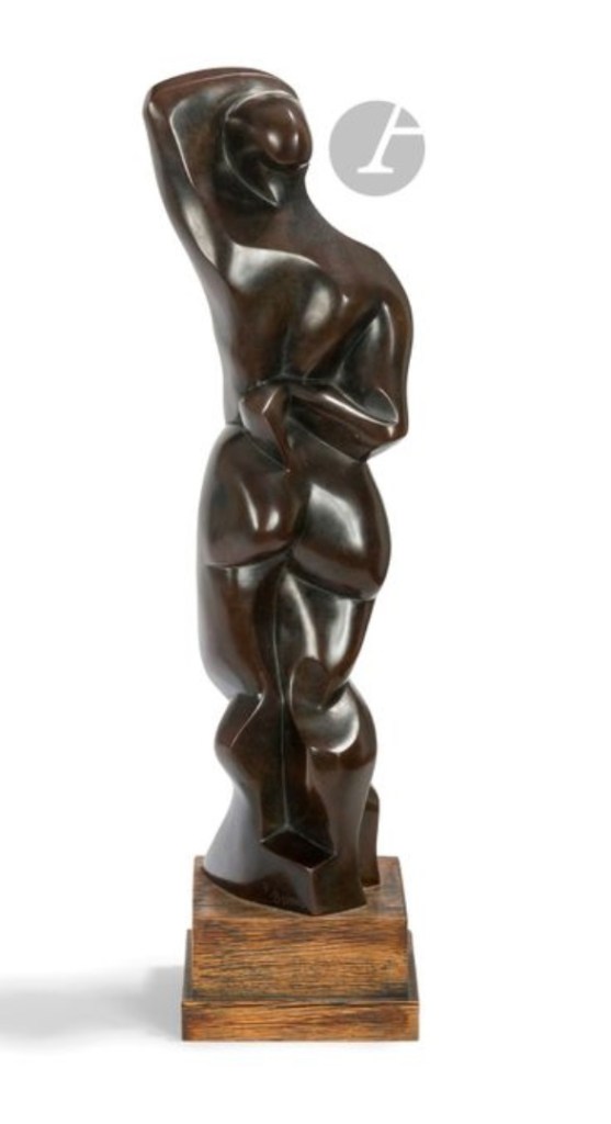 Lot106. D’après Katarzyna KOBRO (1898-1951). Nu féminin, d’après le modèle conçu en [1926. Épreuve en bronze à patine brune. Fonte d’édition post-mortem. Terrasse en bois non d’origine. Numérotée 7 / 8 et porte le cachet ” CLEMENTI Fondeur ” vers la base. Hauteur du bronze seul : 47 cm.Deux épreuves d’édition post-mortem sont conservées dans les collections du Musée d’Art de Lodz (Pologne). Estinate 3,000 – 4,000 euro. Ader. 02/26/20