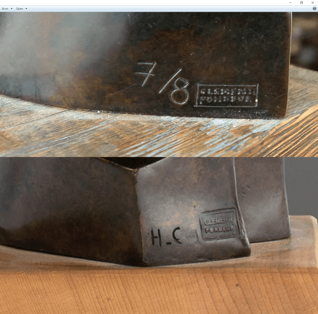 Ader wysłał dociekliwemu czytelnikowi dodatkowe fotografie pokazując znak odlewni (foundy) firmy tj. Clementi. Tak sie składa, że na stronie cyfrowej Muzem Narodowego w Warszawie jest dość dobrze opisany ten odlew rzeźby Kobro z wieloma fotografiami oraz możliwością obejrzenia tego znaku: http://cyfrowe.mnw.art.pl/dmuseion/docmetadata?id=31513&show_nav=true. Na odlewie z NMW znak Clementi stanowi integraną częśc rzeźby – odlany jest brązie. Na odlewie rzeźby z firmy Ader znak foudry jest 1) w innym miejscu, 2) nie został odlany lecz WYRYTY w brązie ostrym rylcem. Przybliżając ten znak dokładnie widać ruchy rylca oraz różne głębokości rycia powstałe w wyniku różnicy nacisku ręki. Proszę przyjrzeć się i powiększyć poniższą fotografię.