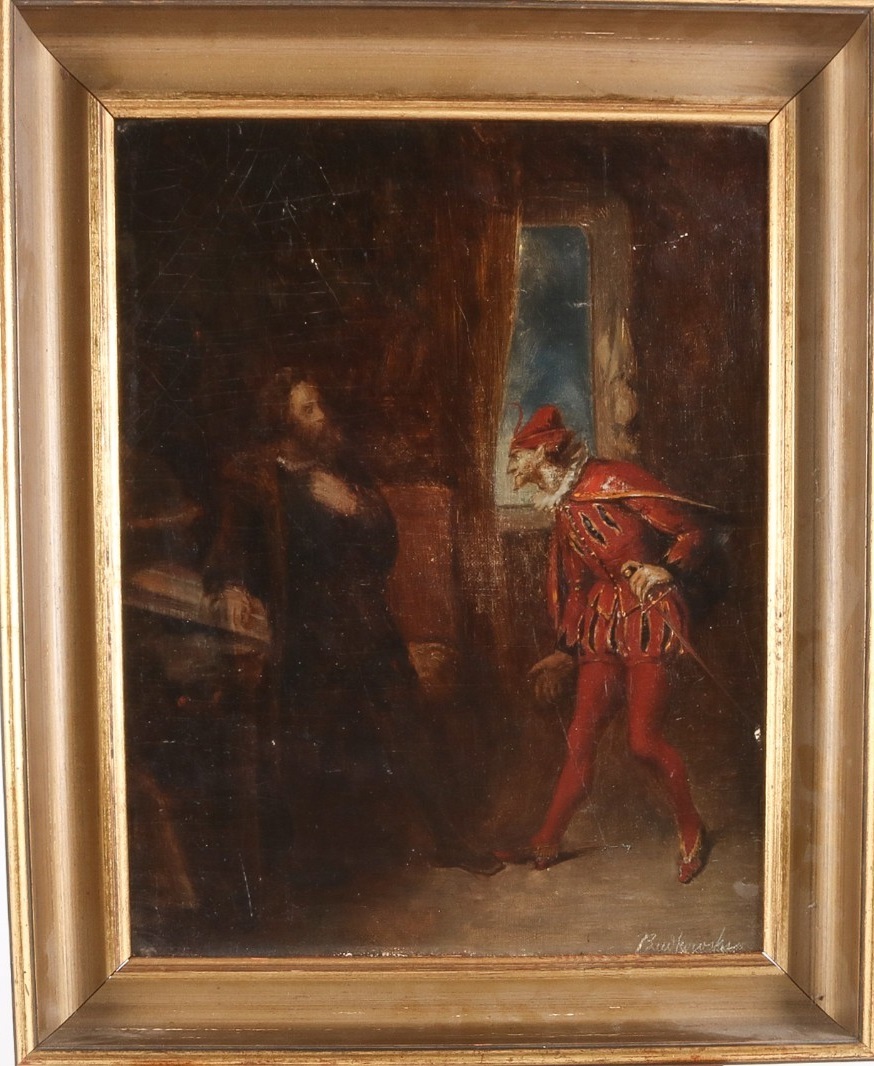 Lot number: 5623851.Gustav Daniel Budkowski (1813-1884). Teaterscene – Faust. Olie på lærred opklæbet på plade. Sign Budkowski, 32 x 40 (41 x 50) cm. Estimate DKK 9,600 (1,290 euro). Lauritz. 03/29/20