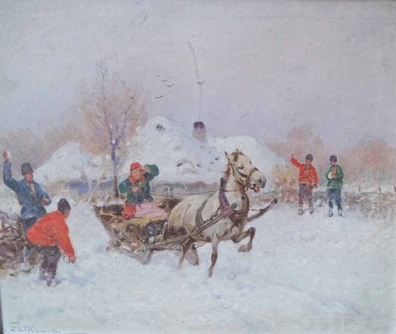 Zabawa w śnieżki czyli słabiutki olej Setkowicza. Bezrybie na rynku. Wirus komuś pomieszał w głowie skoro obrazek sprzedano za 650 euro.