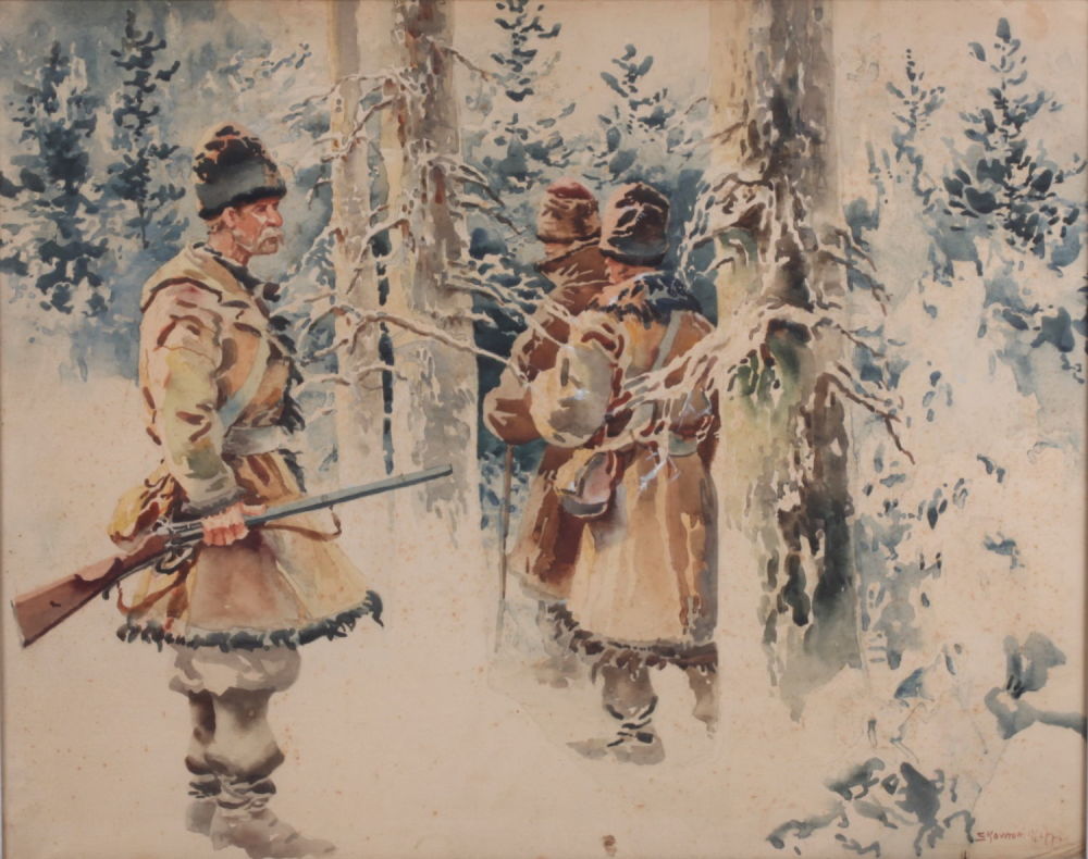 LOT 83: Unknown artist. Poland. Hunters in winter. Signed and framed. 1890s. Paper, watercolor. 47×59 cm. Estimate €150 – €300. Artmaximum (Russia). 04/04/20
