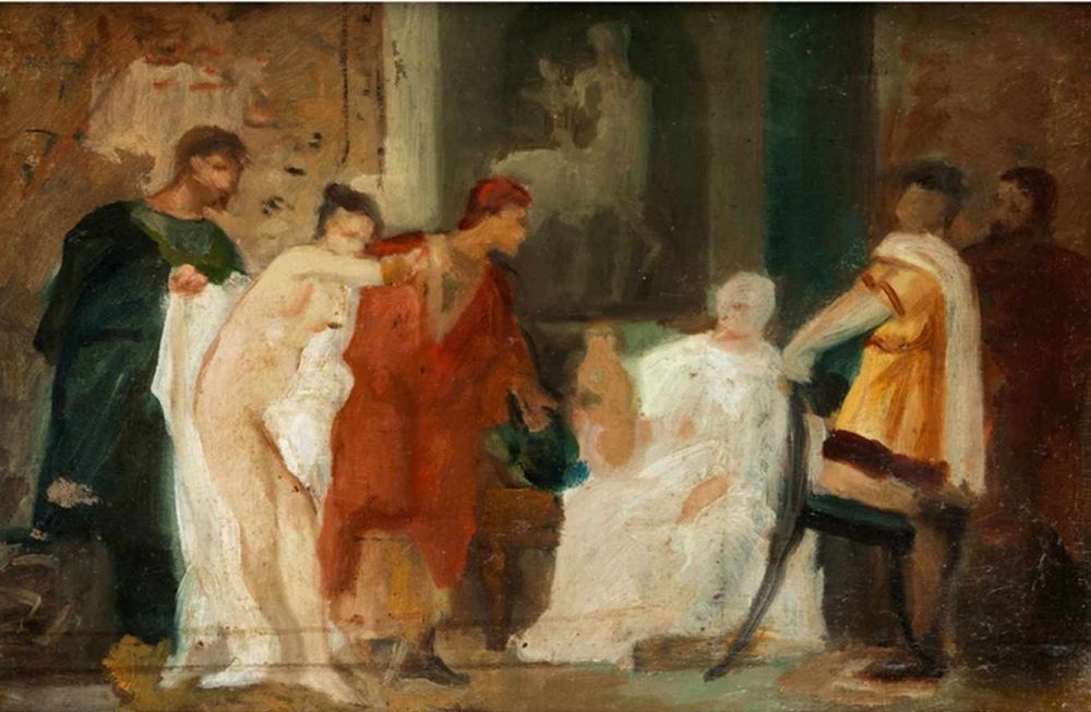 Lot 742. Henryk Ippolitovich Siemiradzki, 1843 – 1902, attributed. THE GIRL OR THE VASE. Oil on canvas. 28 x 42 cm. In narrow gilt wooden strip. Bozzetto or sketch for a larger painting which is also titled Presentation of a female Slave. Notes: The painting, which was probably created from this sketch in large format with many details was sold at Sotheby’s in 2005 for over 1 million US dollars. Estimate 10,000 – 12,000 euro. Hampel. 04/02/20