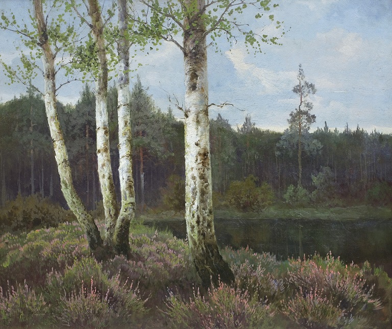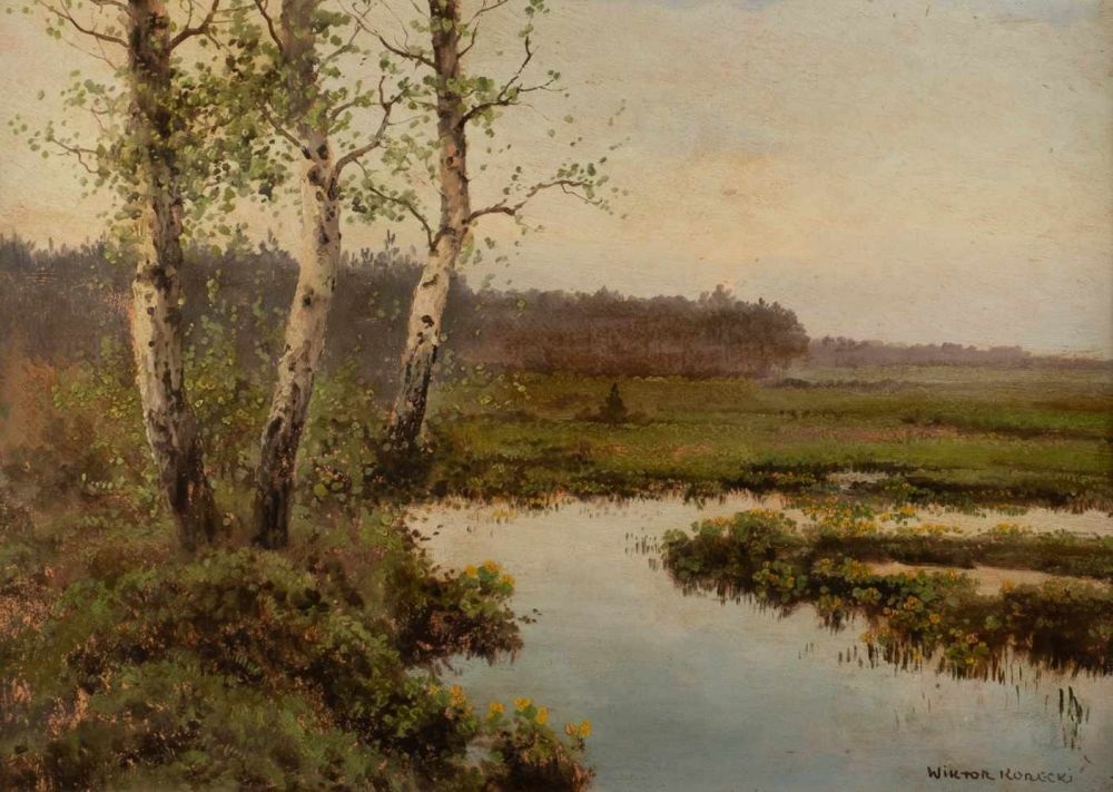 Lot 1277. VICTOR KORECKI 1890 Kamyanets-Podilski/ Ukraine – Komorow/ Poland 1980. A river landscape with birch trees. Oil on carton, 49,5 by 69,5 cm, lower right signed ‘Wiktor Korecki’, min. losses of the paint, framed. Reserve 600 euro. Hargesheimer Kunstauktionen Düsseldorf GmbH. 04/25/20