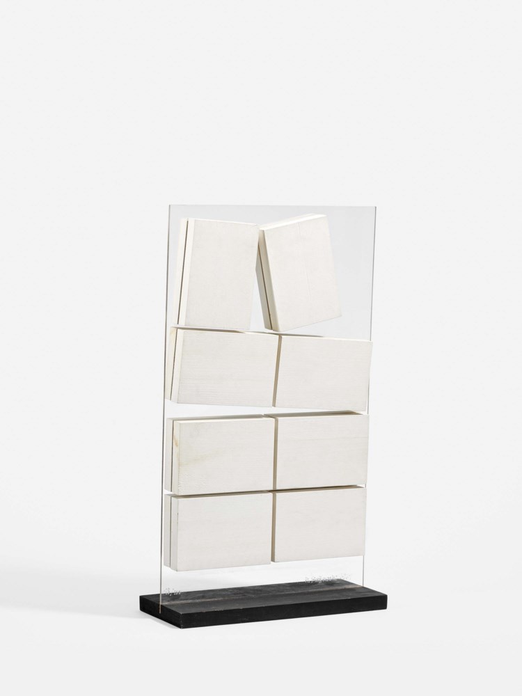 Lot 842. STAZEWSKI, HENRYK Warschau 1894 – 1988. Composition Spatiale, 1961. Holz und Plexiglas, 59 x 33 x 15cm. Nummeriert, signiert und datiert unten im Plexiglas: 18/100 H. Stazewski 1961. Galerie Edition Hoffmann, Friedberg. 18/100. Beiliegend das dazugehörige Mappenwerk mit Siebdrucken des Künstlers. Provenienz: Galerie Edition Hoffmann, Friedberg; Privatsammlung Nordrhein-Westfalen. Estimate 5,000 – 7,000 euro. Van Ham. 06/17/20