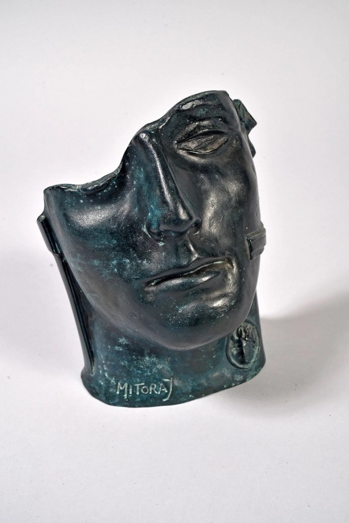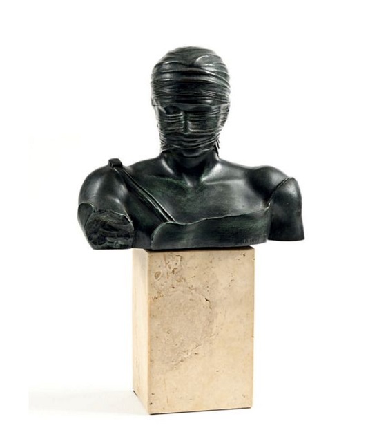 Lot 115. Igor MITORAJ (1944 – 2014). Buste de Persée. Bronze à patine vert antique. Signé « MITORAJ » sur le devant et numéroté « B839/1000HC ». H. 49 cm dont socle en travertin H. 10 cm. Estimation: 1 500 – 2 000 €. Crédit municipal de Paris. 07/02/20