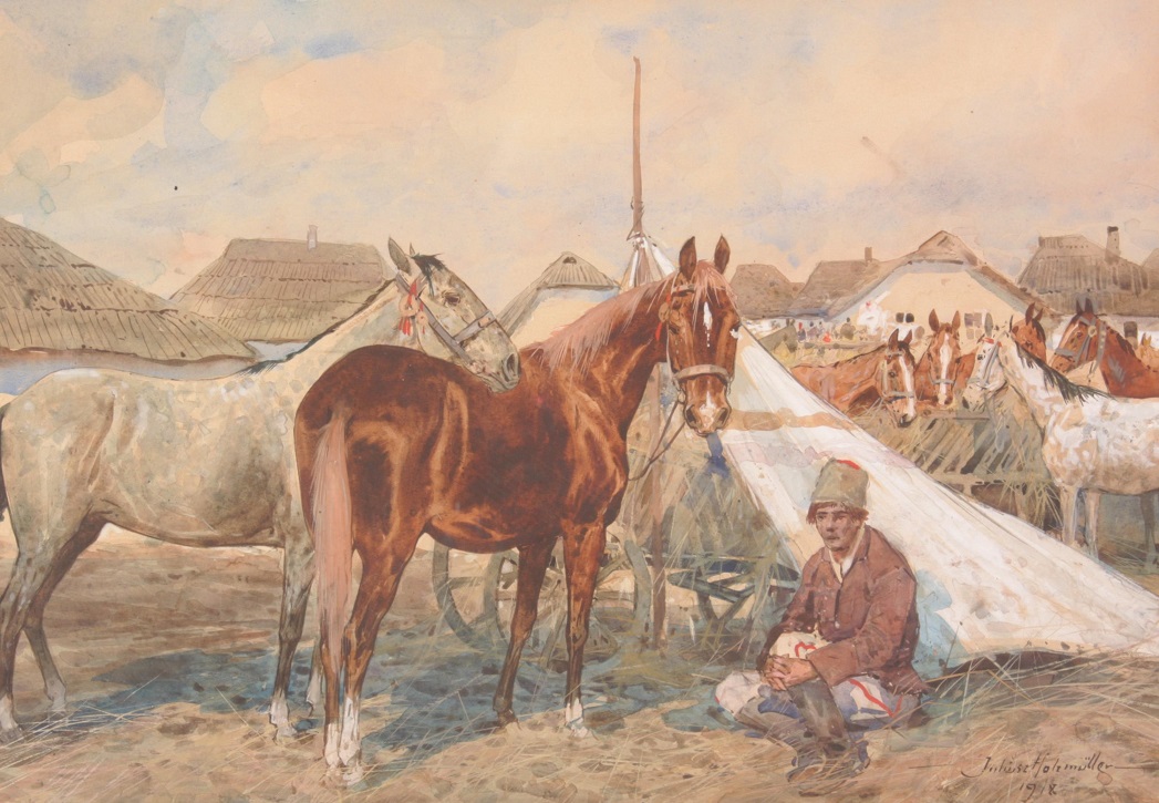 Lot 156. Julius Holzmüller (Bollchow/Polen 1876-1932). Im Heereslager, handsigniert, datiert Juliusz Holzmüller 1918, Aquarell auf Papier, Bildausschnitt 32 x 47 cm, Passepartout, verglast, in bronzefarbigem Holzrahmen, Altersspuren, fleckig, Rahmen bestoßen. Reserve 400 euro. Dorotheum. 06/22/20