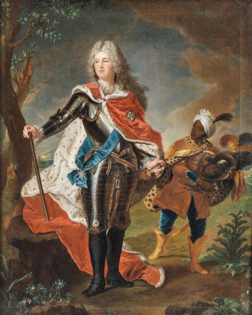 Lot 77. After Hyacinthe Rigaud, 18th Century. Portrait of Frederick Augustus II, later Augustus III, Elector of Saxony and King of Poland (1696-1763), standing full-length, attended by a page, oil on canvas, 80.3 x 64cm (31 5/8 x 25 3/16in). Estimate £ 2,000 – 3,000. Bonhams. 07/22/20