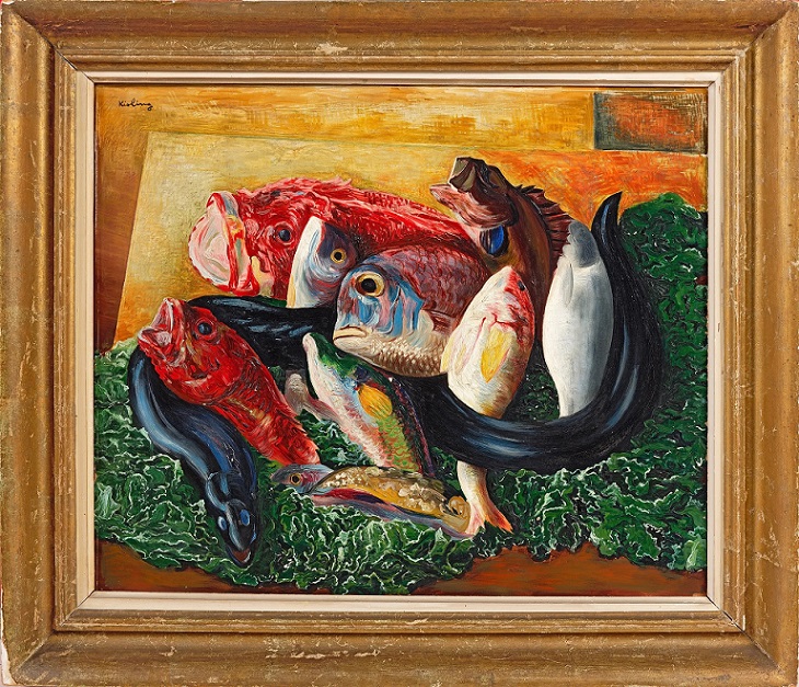 Dość niecodzienna martwa natura Mojżesza Kislinga z szeregiem różnych ryb. Dobra proweniencja pracy. Warto rozważyć.