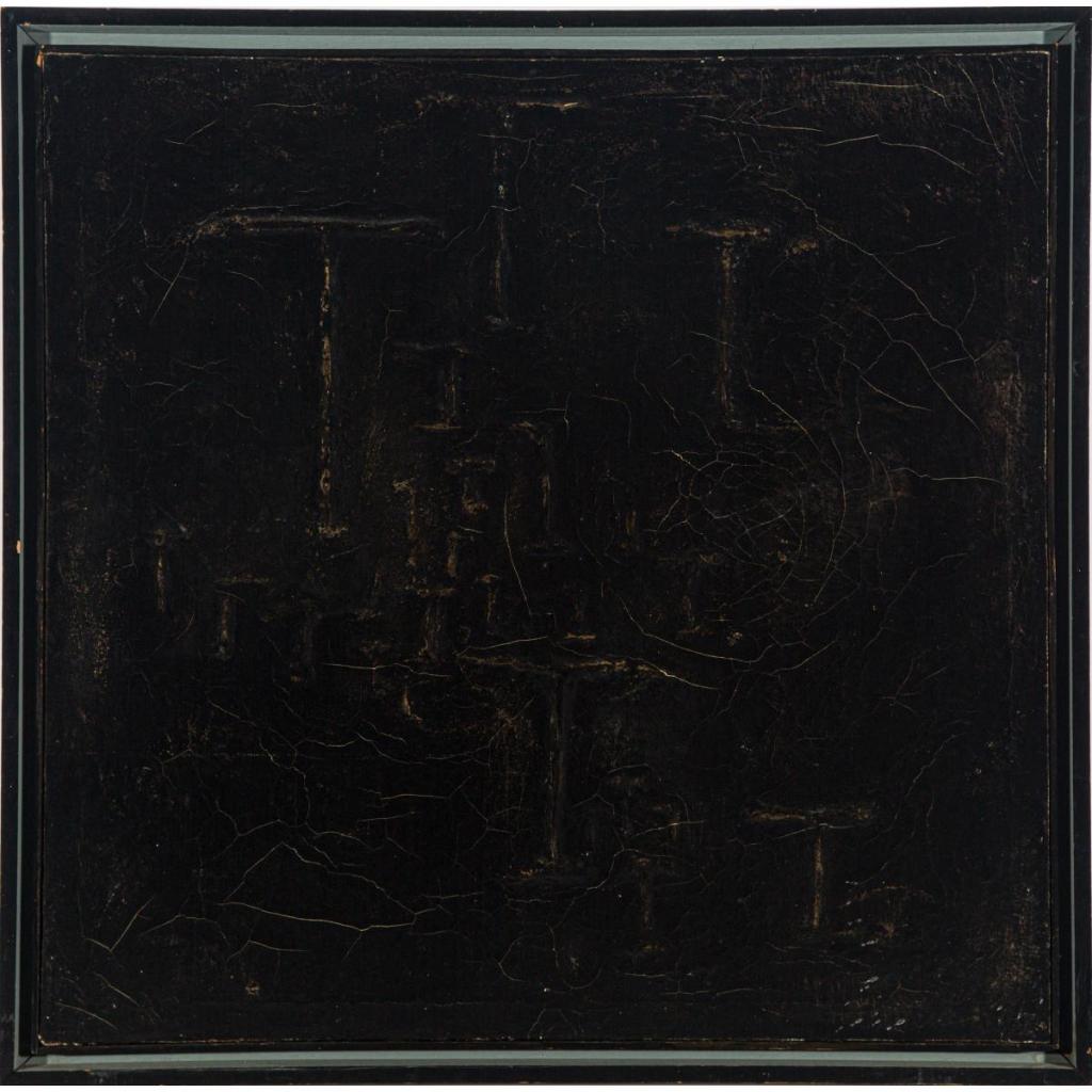 Lot 566. WITOLD URBANOWICZ (1931-2013), POLISH. COMPOSITION NO. 1, CIRCA 1962. Mixed-media with relief on canvas; signed at Krakow and inscribed below it “Kościuszki 48 m 23” in pen and ink lower right verso, further inscribed “KWADRAT/ Gora (with a vertical arrow diagram for hanging) and Doc” in pen and ink lower left verso; titled to gallery label verso, also inscribed to another faded label: “14.11.62” / 69/62″ in blue ink bottom right verso; 26 x 26 in — 66 x 66 cm
