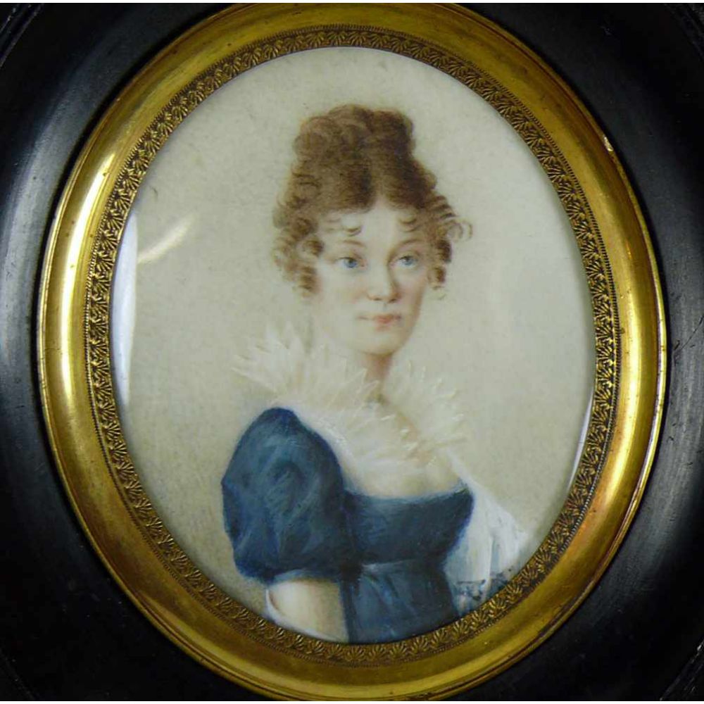 Lot 617. Miniaturist (19.Jh.). Darstellung der “z Tarnowskich Olimpia Grabowska” (1788-1874); Halbportrait, zur Seite gewandt; Mischtechnik/Elfenbein; in schwarzem Holzrahmen mit Messing-Montage; Darstellung: ca. 7 x 5 cm. Starting 200 euro. Auktionshaus Geble. 10/24/20. Sold 1,700 euro