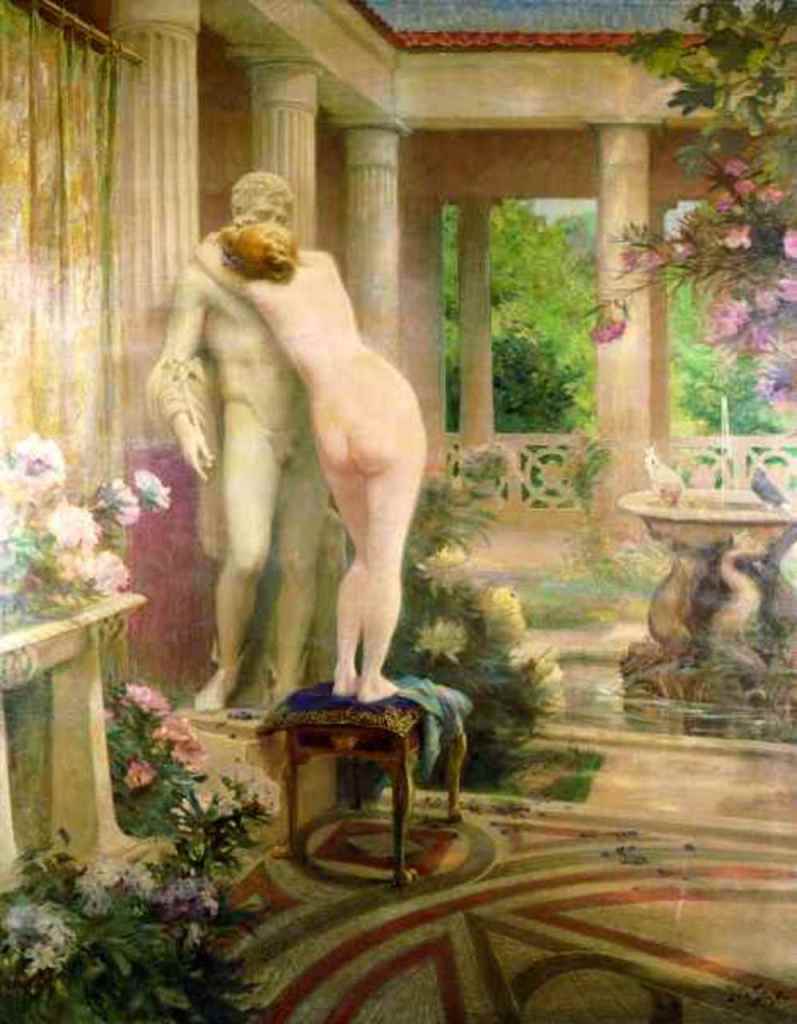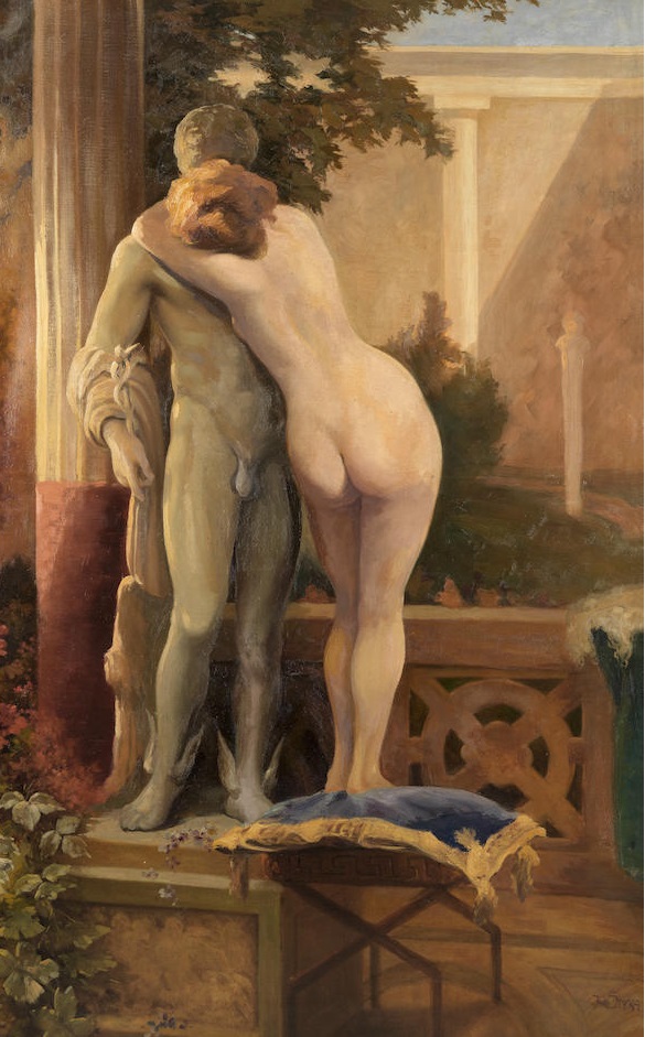 Lot 199. Adam Styka (Polish, 1890-1959). Nude embracing a statue of Hermes, signed ‘JanSTYKA’ (lower right), oil on canvas, 82.2 x 132.6cm (32 3/8 x 52 3/16in). Estimate £ 4,000 – 6,000. Bonhams. 11/10/20.