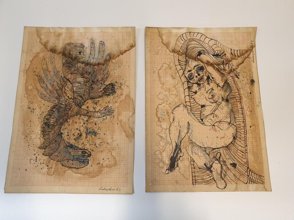 Lot 21. Jan Lebenstein Polish (1930 – 1999), pair of signed pen & ink coloured sketches on graph paper Lebenstein 63 & 74. He studied painting at the Academy of Fine Arts in Warsaw under the guidance of Prof. Artur Nacht Samborski. He made his debut at the exhibition in Warsaw Arsenal in 1955 winning the Jury Award. In 1959 he received the Grand Prix at the 1st International Biennale of Young Artists in Paris. From that moment the painter lived in France. Size 29.5cm W x 42cm H water marks and creasing. Estomate 1,000 – 1,400 euro. Cadmore Auctions Ltd. 11/02/20