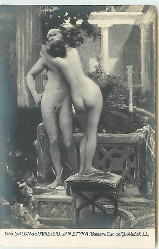 Moim zdaniem, Jan Styka drętwo malował akty kobiece, może za wyjątkiem tej właśnie pracy z Christie’s. Warto ‘zaobserwować’ wyraziste i realistyczne męskie ‘klejnoty rodzinne’ na pracy w Christie’s czego nie ma w pracy w Bonhams.